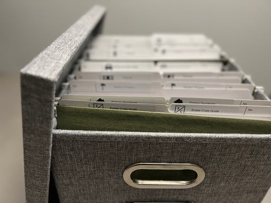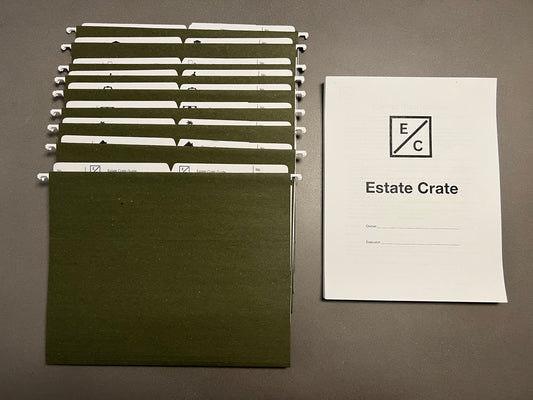 Estate Crate guided workbooks are Personal and Estate Organizers that keep your information in a physical format that is easy to navigate and is categorized to simplify your life. Our products guide you through a step-by-step process to document everything you own or manage, and to prepare for life's unfortunate eventuality. Our packages save families and Executors hundreds of hours.
